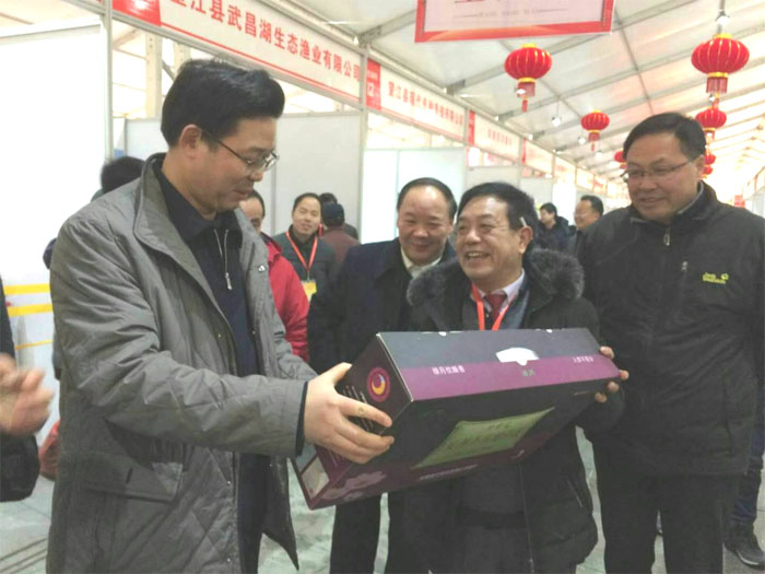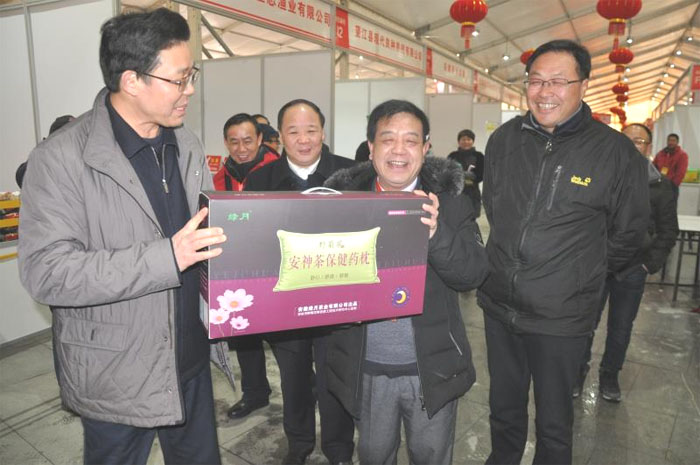 安慶市副市長(zhǎng)楊林與總經(jīng)理宋根全在《安慶市名優(yōu)農(nóng)特產(chǎn)品交易會(huì)》就菊花枕生產(chǎn)銷售進(jìn)行交流